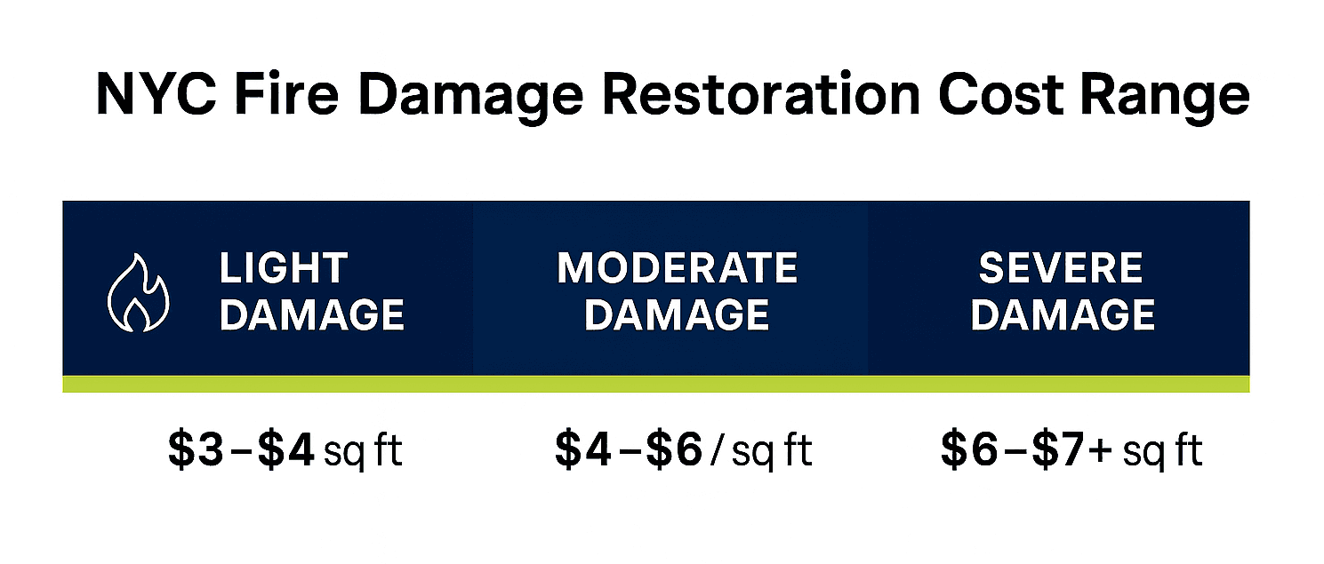 NYC fire restoration typically costs $3–$7+ per square foot, depending on severity.