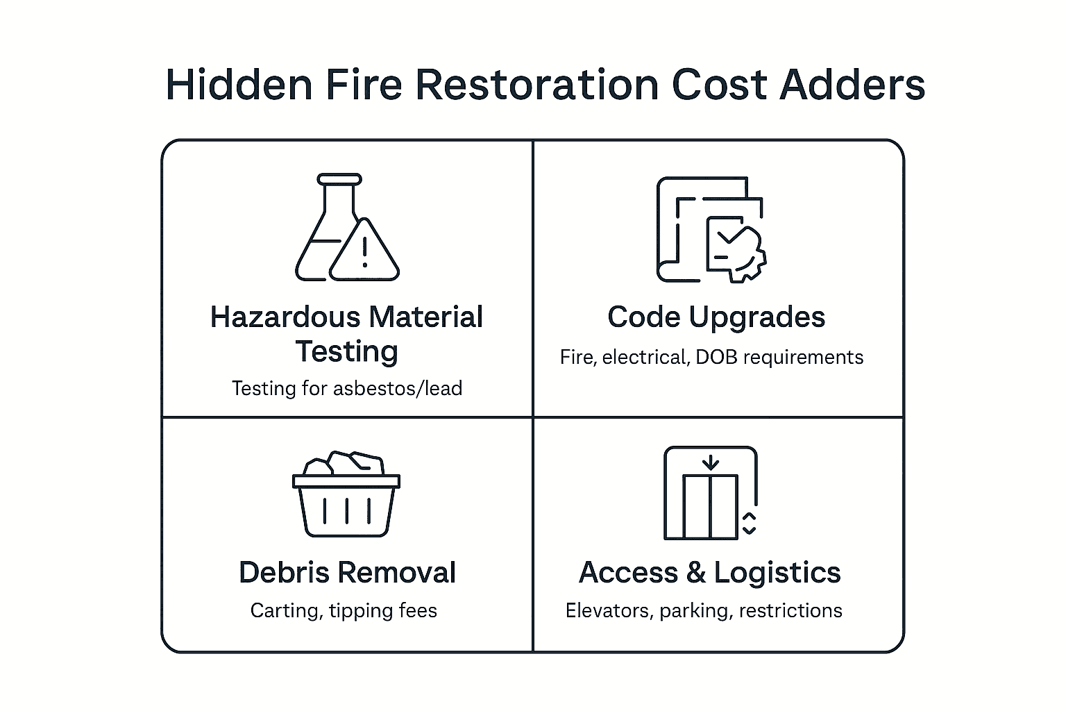 Debris removal, hazardous material testing, and required code upgrades are common hidden cost adders.